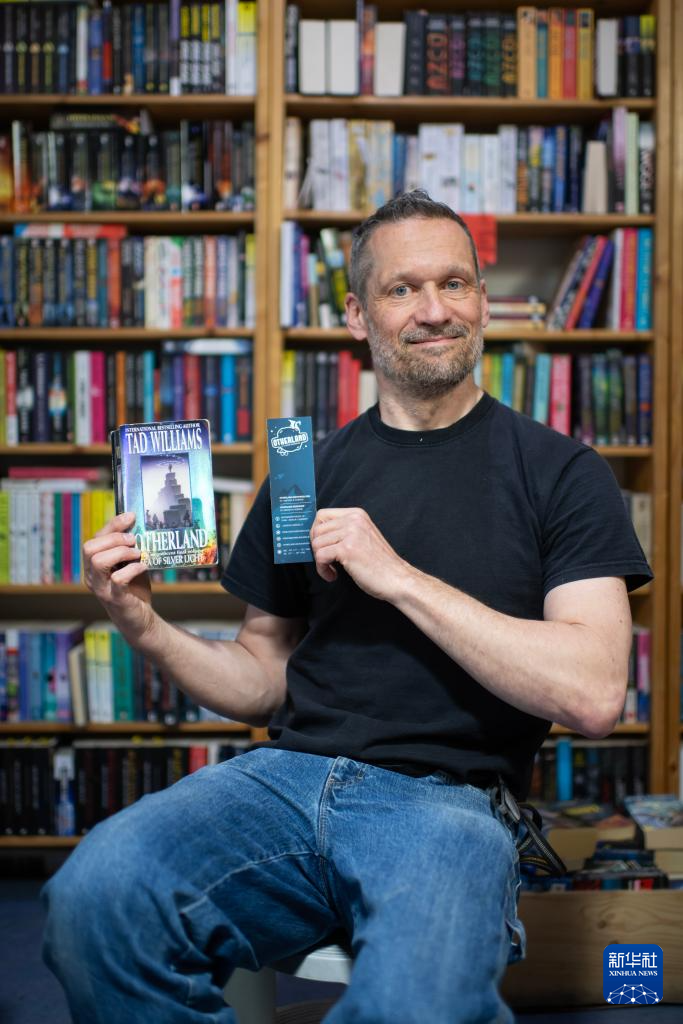 4月16日,在德国柏林,异境书店合伙人之一沃尔夫冈·特雷斯手持书店名称来源的书籍。