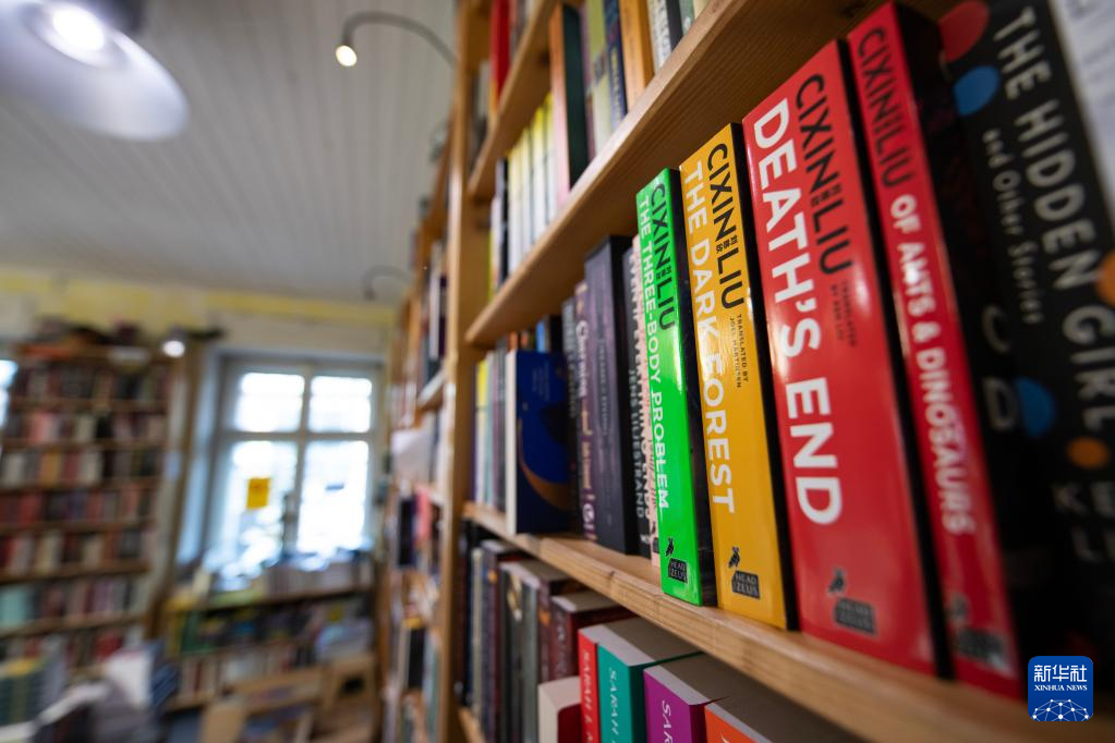 这是4月16日在德国柏林异境书店内拍摄的中国科幻作家刘慈欣的作品。