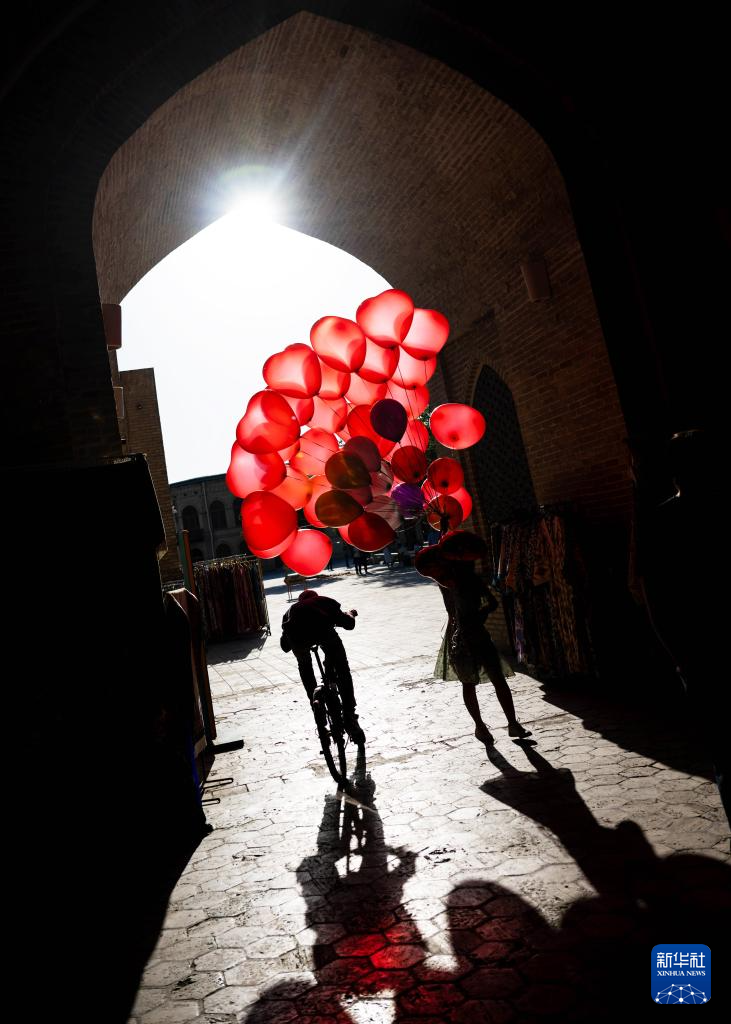 4月24日,一名卖气球的女孩走在乌兹别克斯坦布哈拉古城内。