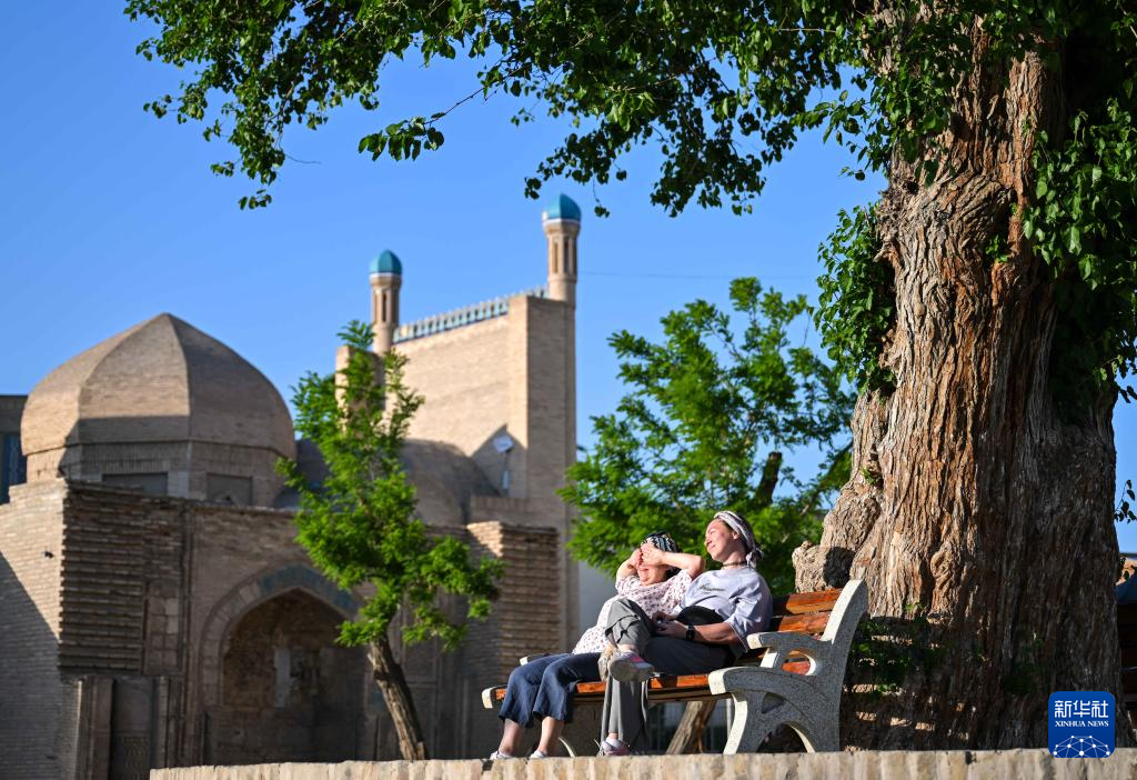 4月24日,人们在乌兹别克斯坦布哈拉古城内享受阳光。