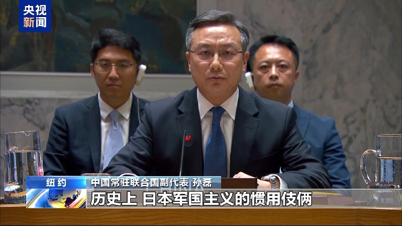 中国常驻联合国副代表孙磊:历史上,日本军国主义的惯用伎俩就是通过制造外部威胁,煽动民族主义,绑架国家机器,对外发动侵略战争。如今日本右翼势力不但从未认真悔改,反而在涉及中国台湾、二战历史和军事安全等问题上挑衅冒险举动频频。